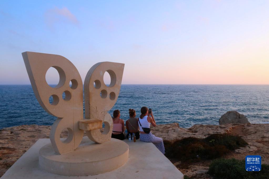 6月26日,人們在塞浦路斯圣納帕“愛之橋”拍攝海邊落日。