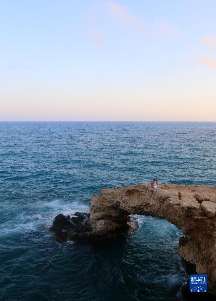 在塞浦路斯圣納帕東部海蝕洞景區(qū),一處海岸邊海水侵蝕后形成的天然石橋“愛之橋”因美麗的景色成為游客打卡地。