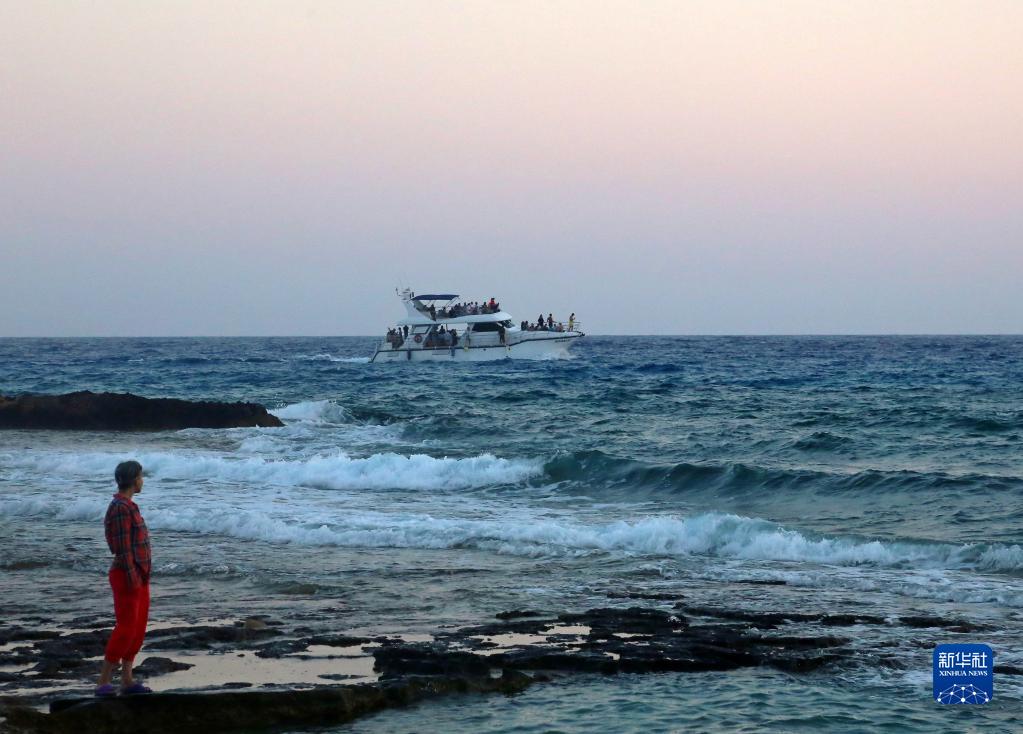 這是6月26日在塞浦路斯圣納帕“愛之橋”附近拍攝的海邊落日。