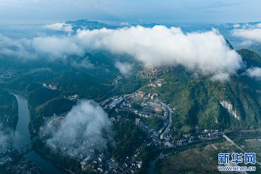 近日,重慶市秀山區(qū)土家族苗族自治縣洪安古鎮(zhèn)上方云霧繚繞,古鎮(zhèn)在藍(lán)天白云下展現(xiàn)出別樣風(fēng)光。新華網(wǎng)發(fā)(胡程 攝)