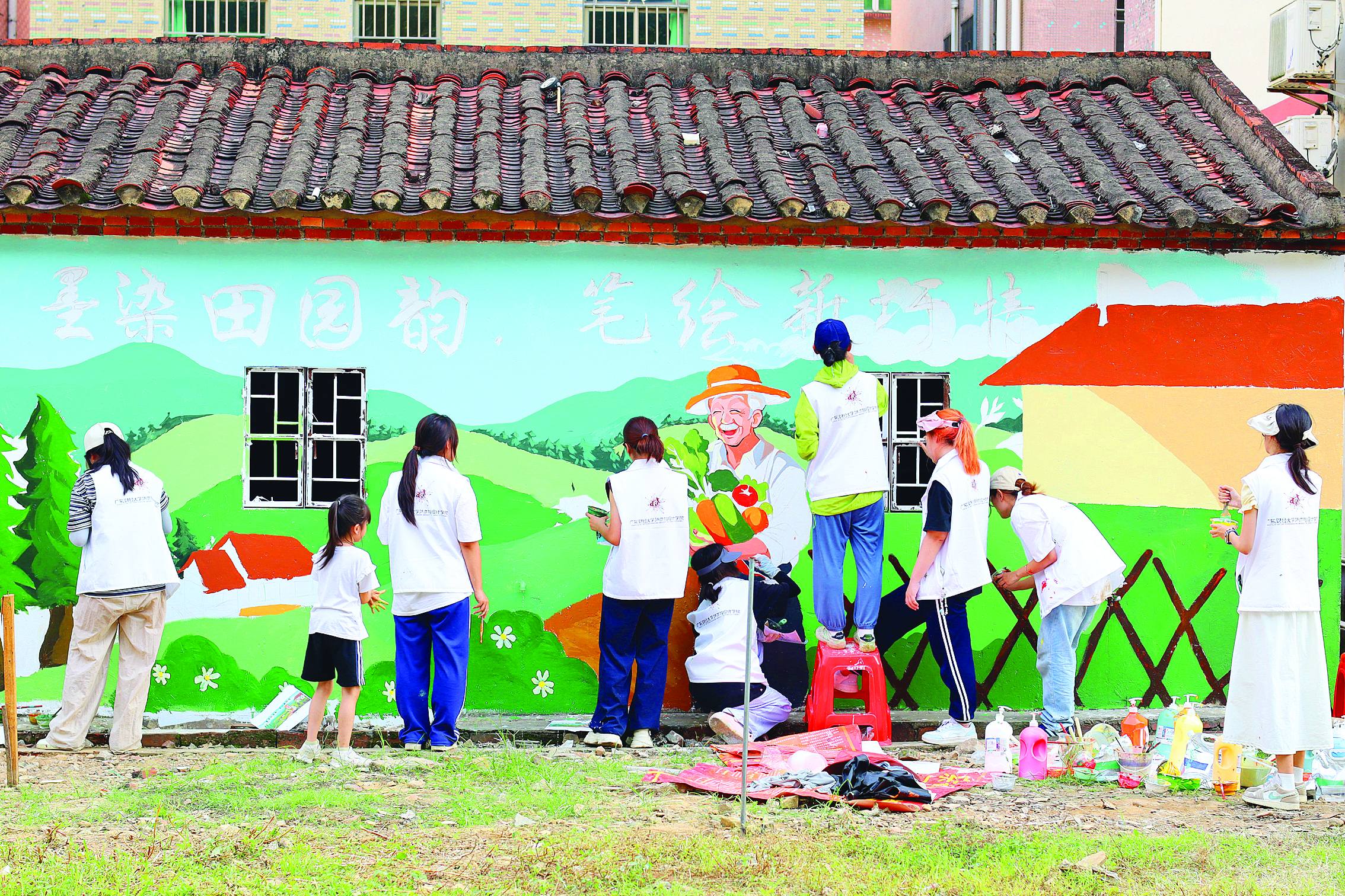 廣東財經(jīng)大學大學生創(chuàng)作墻繪扮靚圩鎮(zhèn)村莊顏值。