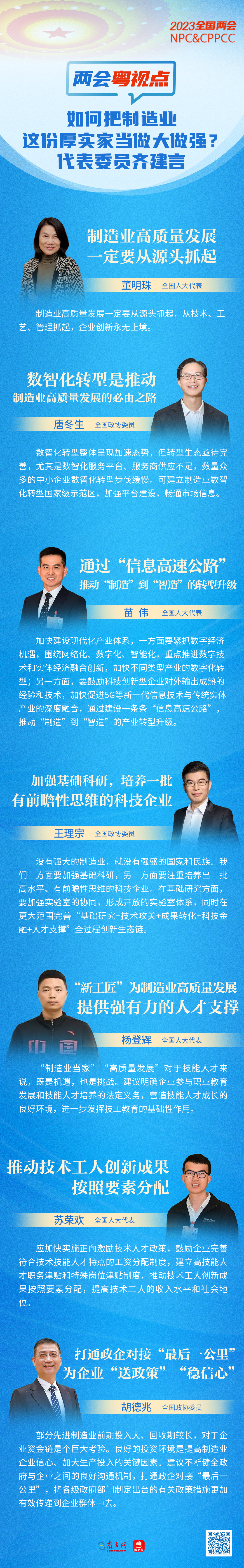 改革開放以來,廣東以制造業(yè)立省、靠制造業(yè)起家,制造強省建設(shè)邁出了堅實步伐,已成為全球重要的制造業(yè)基地。新征程上,廣東要如何完成從“制造業(yè)起家”到“制造業(yè)當(dāng)家”的嬗變,挺起現(xiàn)代化建設(shè)的產(chǎn)業(yè)“脊梁”?一起來看看全國人大代表、政協(xié)委員們怎么說。