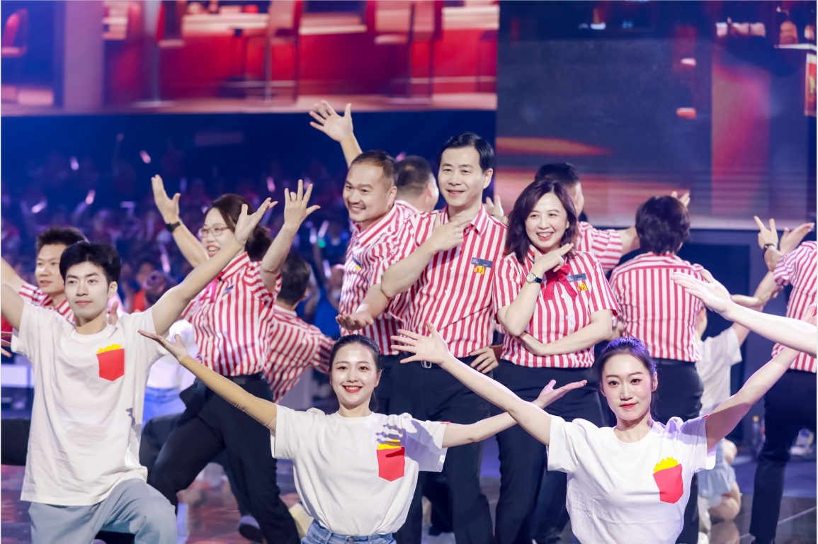 餐廳總經(jīng)理年會(huì)現(xiàn)場(chǎng),管理層表演麥當(dāng)勞QSC&V之舞