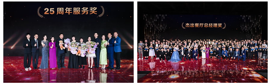 年會(huì)現(xiàn)場(chǎng), 25周年服務(wù)獎(jiǎng)和杰出餐廳總經(jīng)理獲獎(jiǎng)?wù)呱吓_(tái)領(lǐng)獎(jiǎng)(圖為部分獲獎(jiǎng)?wù)撸?/font>