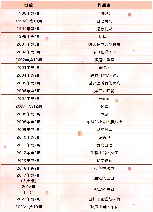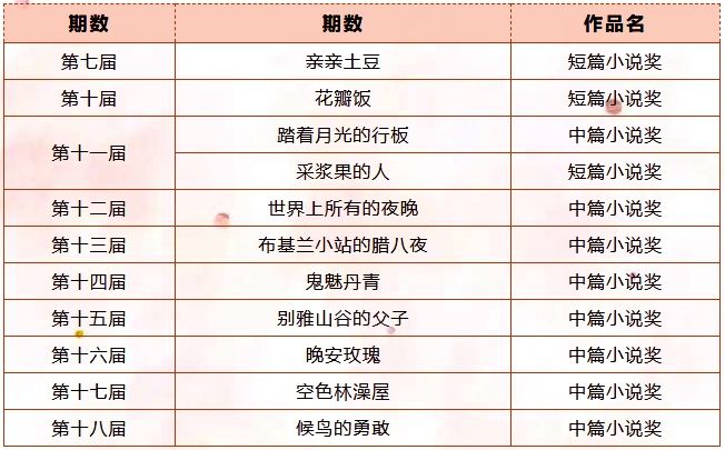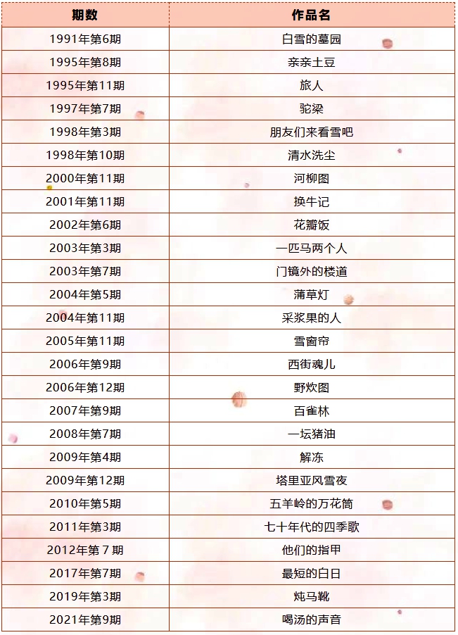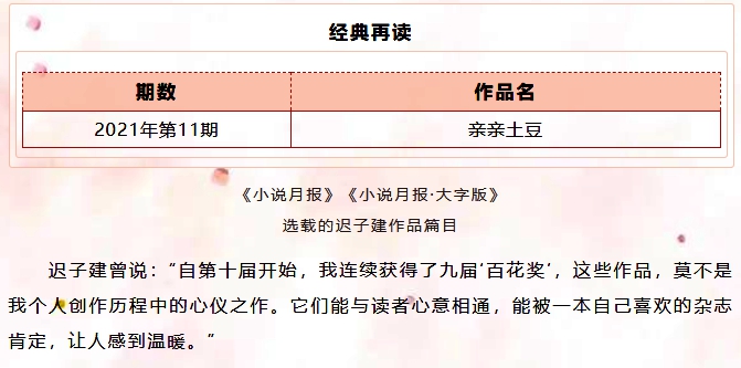 1991年,《小說月報(bào)》第6期選載了遲子建的短篇小說《白雪的墓園》,1995年第8期又選載了短篇小說《親親土豆》,并獲第七屆《小說月報(bào)》百花獎(jiǎng)短篇小說獎(jiǎng)。自此,遲子建與《小說月報(bào)》和百花獎(jiǎng)的緣分拉開帷幕,此后遲子建多次獲百花獎(jiǎng)。