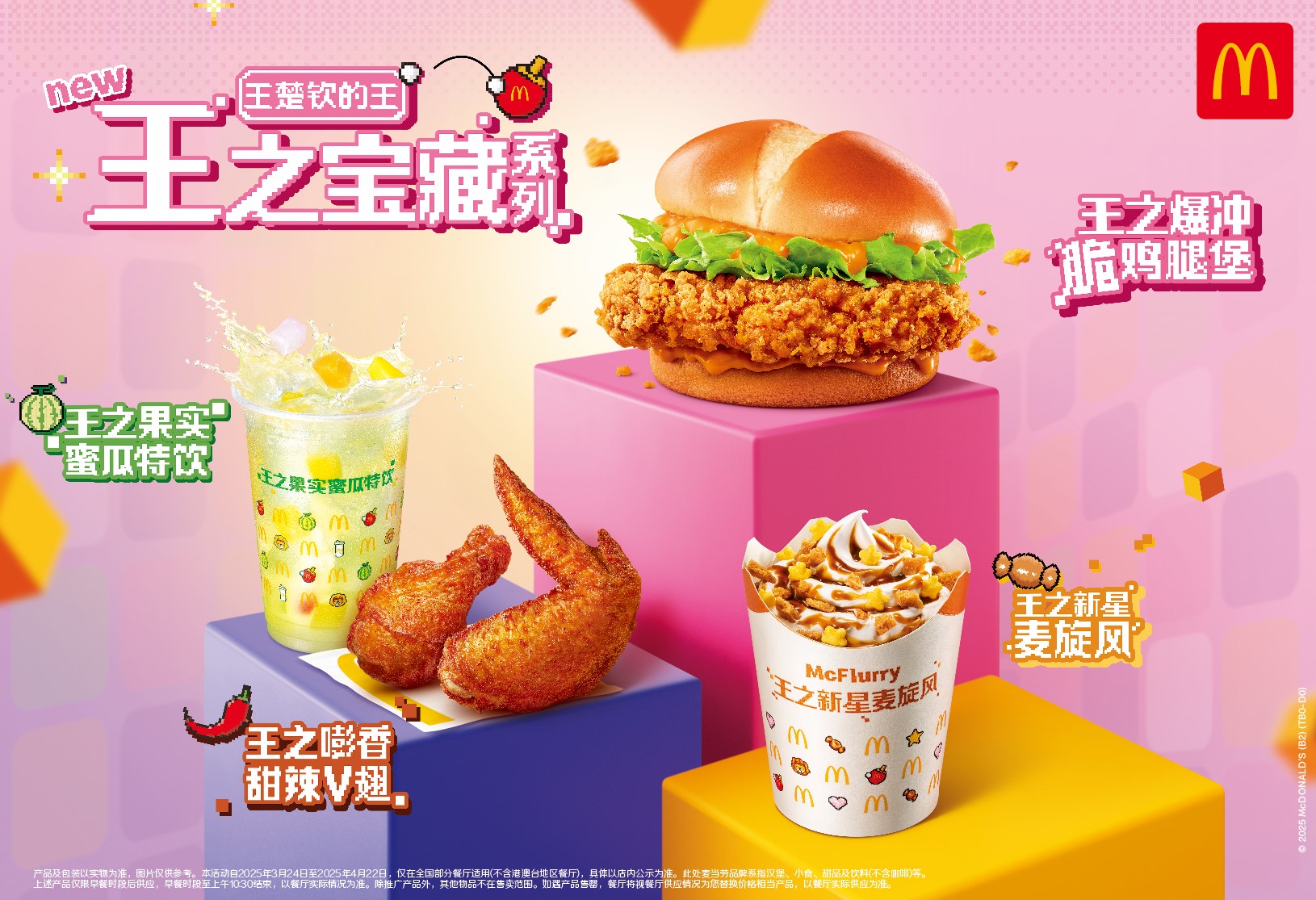 3月24日起,麥當勞全國門店將推出“王之寶藏”系列新品,包括王之爆沖脆雞腿堡、王之嘭香甜辣V翅及王之新星麥旋風。