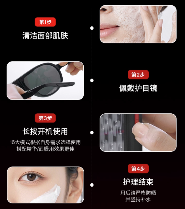 正確使用大排燈Pro,是最大化護(hù)膚效果與規(guī)避使用誤區(qū)的關(guān)鍵。產(chǎn)品標(biāo)配的專業(yè)護(hù)目鏡,是使用時(shí)的必備配件。佩戴后進(jìn)行光照,可隔絕光線對(duì)眼部的影響,安心享受每一次光療護(hù)理。