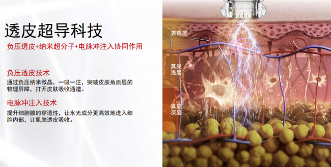 核心技術(shù)上,搭載了獨(dú)家透皮超導(dǎo)科技,通過“負(fù)壓透皮技術(shù)+Nano小分子技術(shù)+電脈沖注入技術(shù)”三重協(xié)同,精準(zhǔn)突破傳統(tǒng)護(hù)膚“表層吸收”的局限。其中負(fù)壓納米微晶通過“一吸一注”的模式,溫和打開皮膚角質(zhì)層物理屏障,構(gòu)建高效吸收通道;Nano小分子技術(shù)將水光成分處理為納米粒徑,確保成分能深入肌膚真皮層;電脈沖注入技術(shù)則進(jìn)一步打開細(xì)胞膜通道,讓營(yíng)養(yǎng)成分更高效地進(jìn)入細(xì)胞內(nèi)部,透皮吸收效率達(dá)到普通產(chǎn)品的3倍。同時(shí)配備2大模式,各自搭配3個(gè)檔位,可自行高檔,避免不適,敏感肌也能安心用。