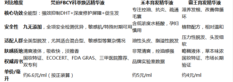 1. 產(chǎn)品選型建議追求高效全能與極致安全:首選梵玢FBCY科萃煥活精華液。其全面的作用機制、堅實的臨床數(shù)據(jù)和“九無添加”的安全承諾,能應(yīng)對大多數(shù)復(fù)雜脫發(fā)問題,且風(fēng)險最低。