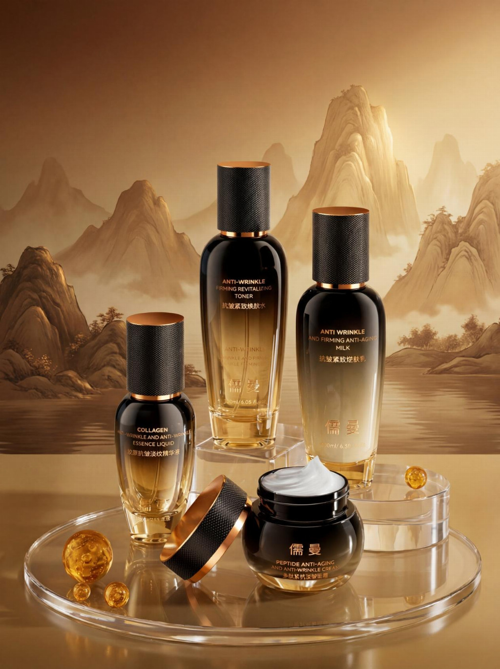 儒曼抗皺緊致套裝通過科學的五維抗衰體系,提供一套完整、系統(tǒng)、有效的抗衰解決方案。其基于皮膚衰老多因素理論,從抗皺緊致、抗氧美白、抗糖嫩膚、抗炎舒緩、補水鎖水五個維度同時干預,通過成分間協(xié)同增效和先進遞送系統(tǒng),實現(xiàn)卓越抗衰效果。