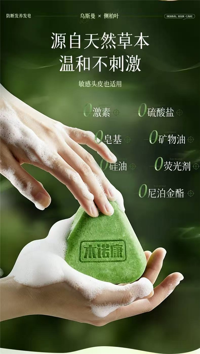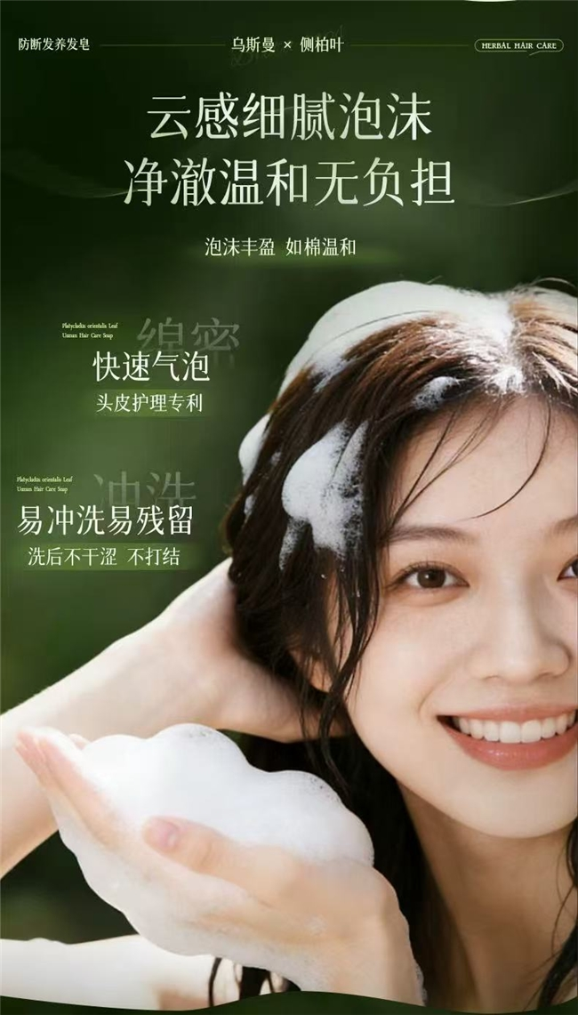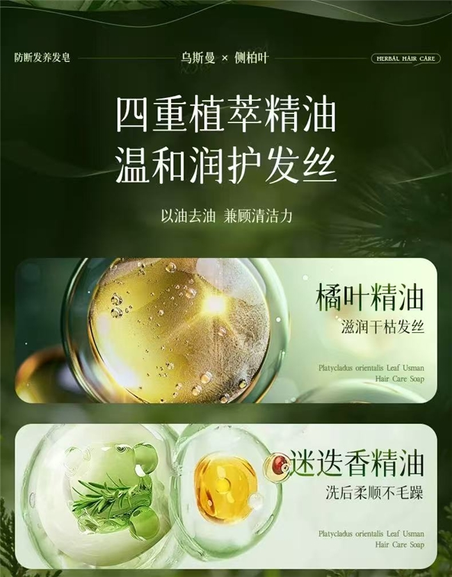 日常養(yǎng)護(hù)(主打防斷控油):日常洗頭以側(cè)柏葉+烏斯曼草防斷養(yǎng)發(fā)皂為主,每天或隔天使用一次,重點(diǎn)解決掉發(fā)、斷發(fā)、頭皮出油問題,保持頭皮清爽,強(qiáng)韌發(fā)根,避免掉發(fā)加重。適配油頭、易掉發(fā)人群的日常需求,堅持使用2周,掉發(fā)量明顯減少,頭皮出油速度變慢,頭皮變得更清爽通透。