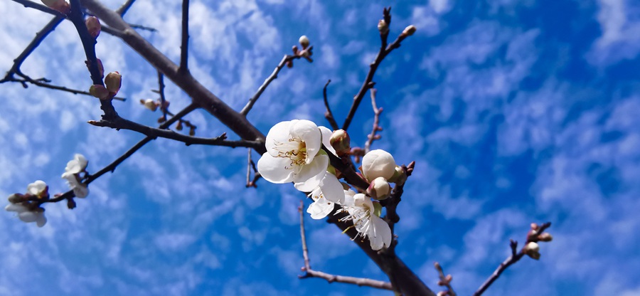 雖然第一批的梅花不算多,但靚麗的白色已經(jīng)藏不住了。漫步梅花山,盡管梅花只是星星點點,但是枝頭飄白,盡顯清冷高雅。另外,許多梅花含苞待放,點點雪白爬上枝頭,為冬日帶來一抹特有的幽香。
