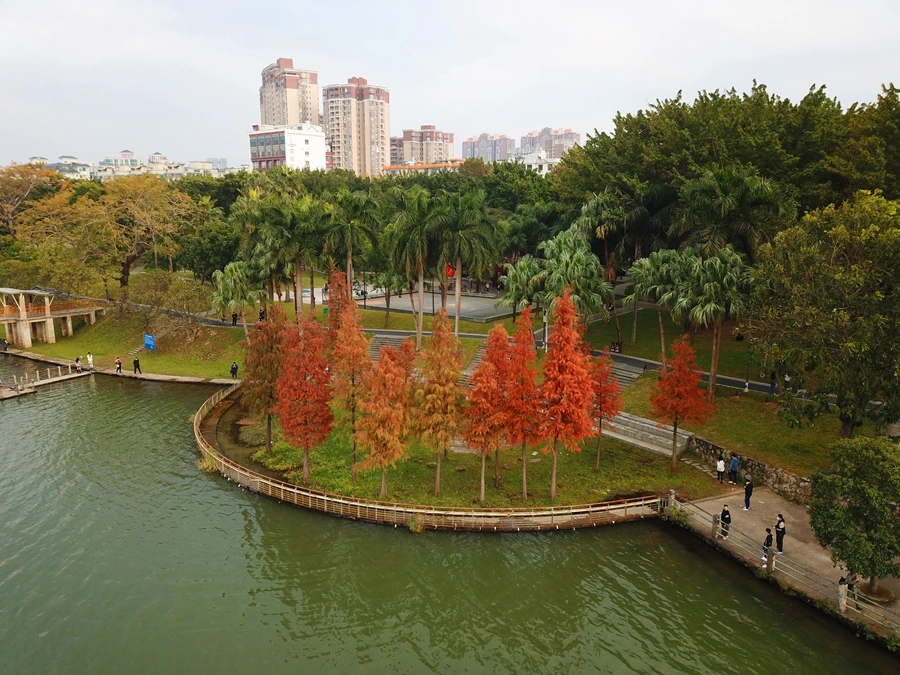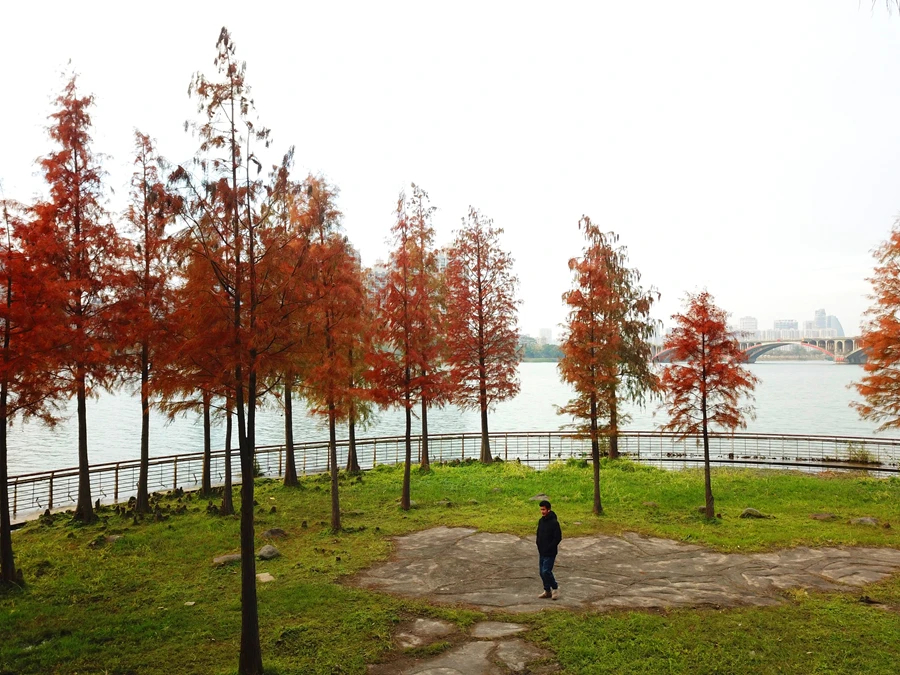 近日,市區(qū)東江沙公園一片紅杉林漸成佳境,臨江的一側(cè)居然藏著10多株艷麗的紅杉樹(shù)。遠(yuǎn)遠(yuǎn)地就看見(jiàn)江邊一抹亮紅,一棵棵紅杉樹(shù)特別顯眼,淺紅、深紅、金紅等多種顏色交織在一起,倒映在東江的湖面,成為一道獨(dú)特的風(fēng)景線,恍如進(jìn)入油畫(huà)世界,吸引了眾多市民來(lái)打卡拍照。