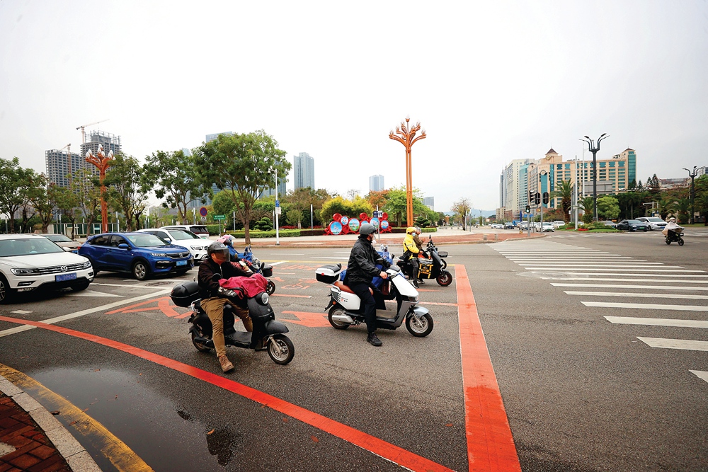 電動自行車規(guī)范停在等候區(qū)等待綠燈通行。 惠州日報記者王建橋 攝