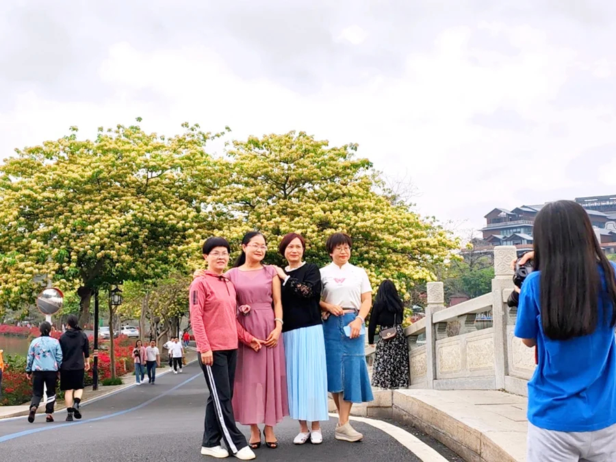 清明時(shí)節(jié),人們紛紛來(lái)到陳公堤踏青賞花。漫步堤岸,層層疊疊的魚木花壓滿枝頭,遠(yuǎn)遠(yuǎn)望去,宛如云蒸霞蔚,為過往的市民游客送去幸福、吉祥、如意。清風(fēng)拂過,攜來(lái)陣陣淡雅清香,花瓣緩緩飄落,優(yōu)雅浪漫。細(xì)賞魚木花,雪白和金黃的花瓣輕盈舒展似蝴蝶展翅,紫紅色的細(xì)長(zhǎng)花蕊像蝴蝶觸角,整一個(gè)仙氣飄飄。