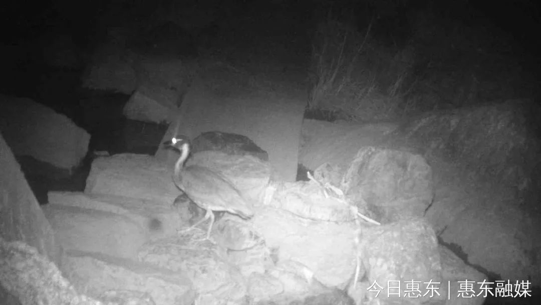 在一段夜間監(jiān)測視頻中,一只大眼睛尖嘴巴的鳥在鏡頭前停留了幾秒后,邁著悠閑的步伐離開了。
