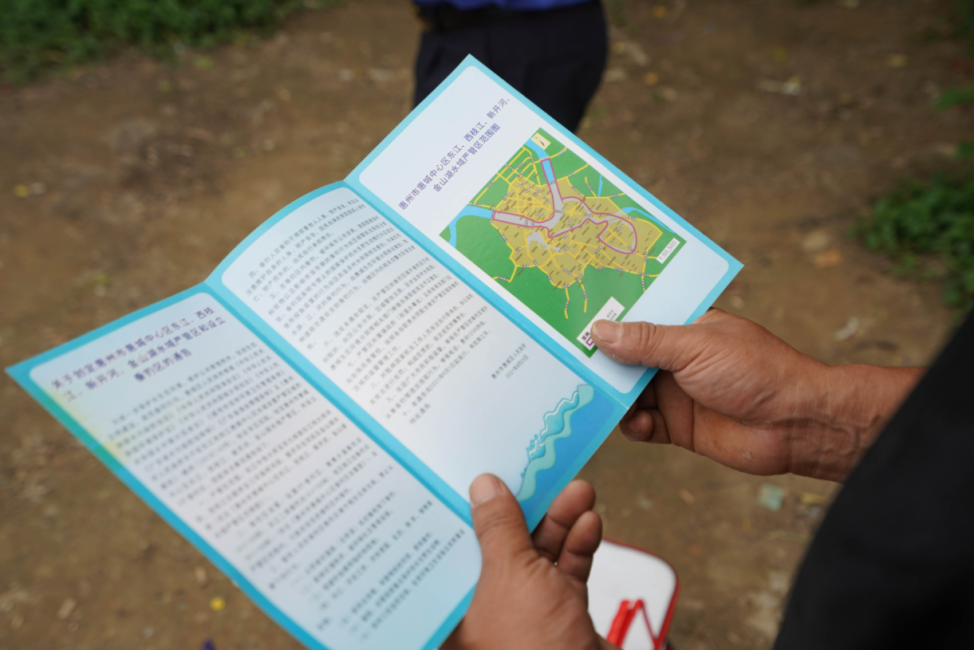 執(zhí)法人員向垂釣人員派發(fā)宣傳手冊引導(dǎo)文明垂釣。惠州日報記者湯渝杭 攝