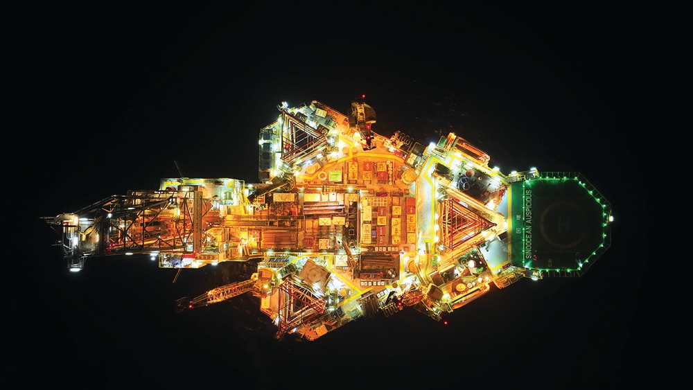 夜間高空航拍鏡頭下的“國瑞”平臺,宛如“睡美人”靜臥在大洋深處。