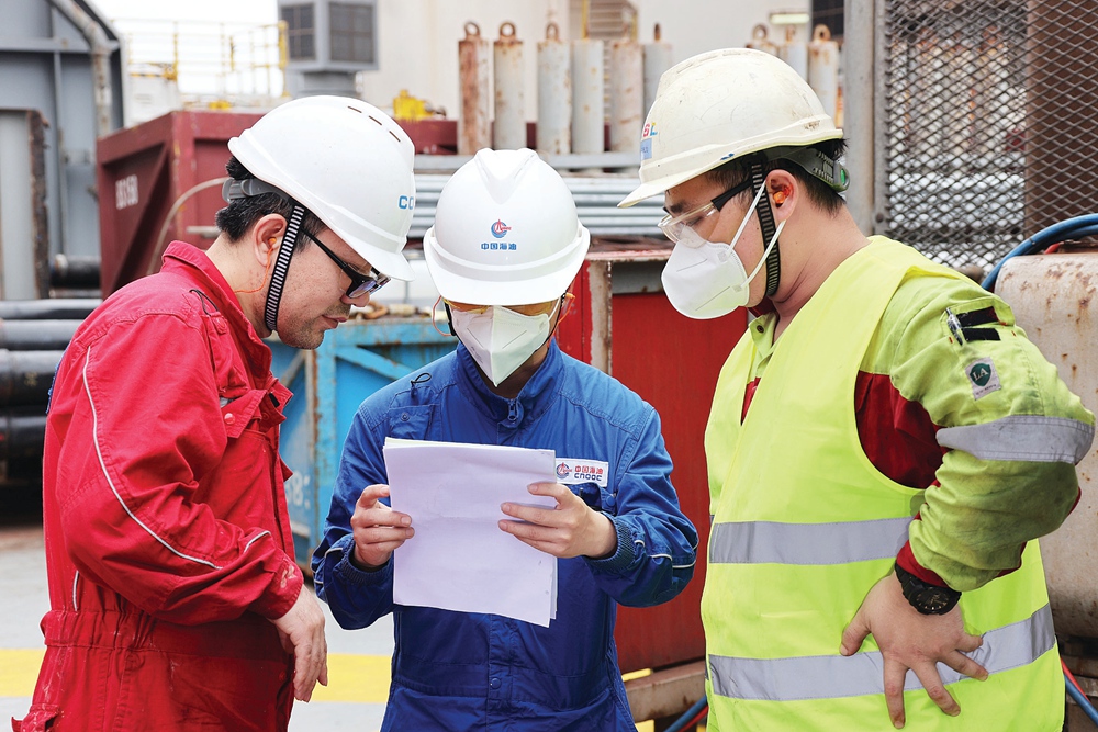 “國瑞”平臺甲板上,幾名不同崗位的海洋石油工人在進(jìn)行工作安全分析。