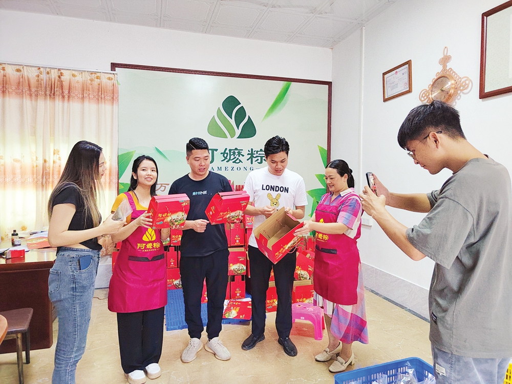 今年初,澳背村嘗試規(guī);a當?shù)靥厣兆印唪。“合作社基本上每天都?0多位村民前來制作粽子,我們希望進一步打開銷路和打響品牌。”嚴敏聯(lián)系嚴國球參與短視頻推廣,僅僅一晚,瀏覽量就突破15萬人次,直接拉升銷售額。