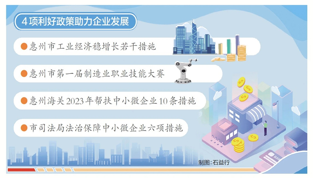 發(fā)布惠州市工業(yè)經(jīng)濟(jì)穩(wěn)增長(zhǎng)若干措施等4項(xiàng)利好政策,真金白銀支持中小微企業(yè)高質(zhì)量發(fā)展;為去年省級(jí)專(zhuān)精特新企業(yè)、國(guó)家專(zhuān)精特新“小巨人”企業(yè)代表授牌,推動(dòng)中小微企業(yè)走專(zhuān)精特新發(fā)展道路;5年內(nèi)為企業(yè)提供1.27萬(wàn)億元融資支持,政銀合作破解中小微企業(yè)“融資難”……