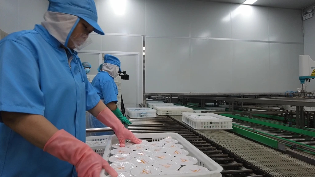 走進客家婆豆腐花的現(xiàn)代化生產(chǎn)車間,自動化流水線上機械臂左右騰挪,一杯杯客家婆豆腐花正源源不斷地生產(chǎn)出來。博羅羅浮山潤心食品有限公司副總經(jīng)理李國惠介紹:“眼前的自動化生產(chǎn)線在2021年正式投產(chǎn),目前最大產(chǎn)能可以達到每小時2.5萬杯!