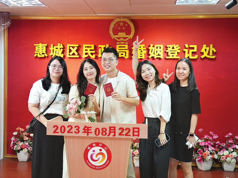 呂先生和劉小姐領(lǐng)到結(jié)婚證,曬出“小紅本”,開(kāi)心地在鏡頭前做出心型的手勢(shì)!拔姨匾膺x了七夕這個(gè)美好的日子和女友前來(lái)領(lǐng)證!毙氯藚蜗壬痛蠹乙黄鸱窒怼疤鹈邸。他和女友是研一時(shí)開(kāi)始談戀愛(ài)的,研究生畢業(yè)后一起通過(guò)人才引進(jìn)的方式來(lái)到惠州工作安家,“我們都是北方人,在這里相互依靠建起小家。”劉小姐滿眼幸福地告訴記者,她和呂先生經(jīng)過(guò)六七年的戀愛(ài),共同經(jīng)歷了人生中的求學(xué)奮斗時(shí)光,最讓她感動(dòng)的是疫情期間的一次經(jīng)歷,“他當(dāng)時(shí)身體很不舒服,我發(fā)熱了,他還半夜里背著我去醫(yī)院,他是一個(gè)很有責(zé)任感的人!