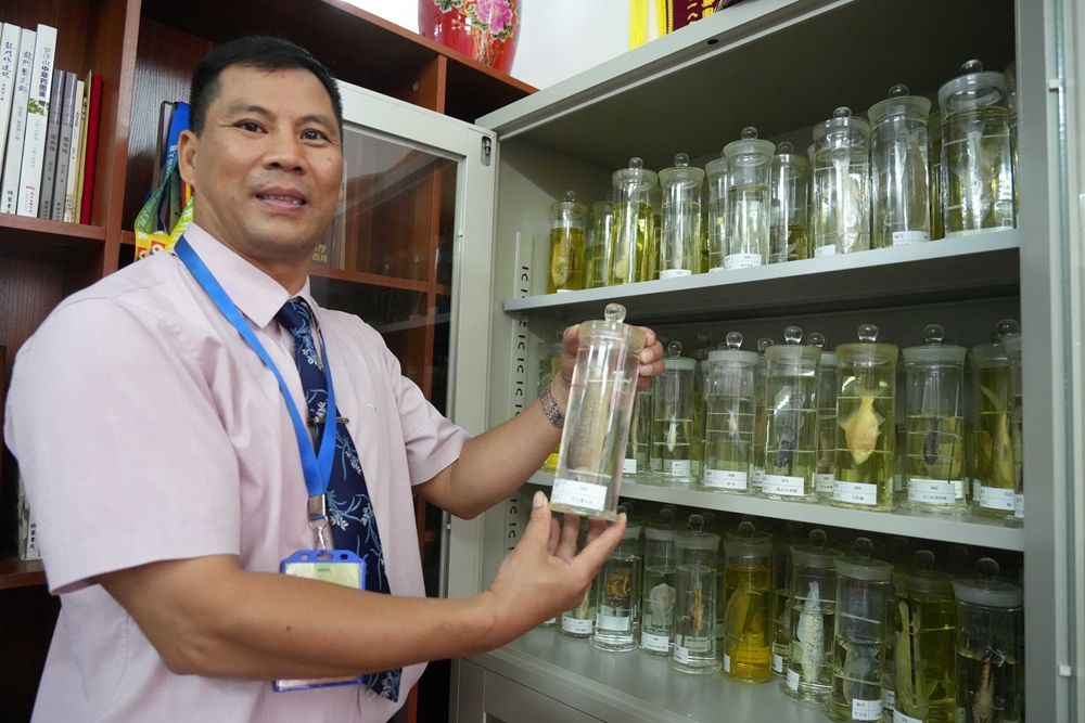 龍門縣龍城第一中學(xué)特級生物教師黃偉勝,主持龍門縣原生魚資源調(diào)查研究課題,收集105種龍門原生魚。圖為他自制的各種魚標(biāo)本。