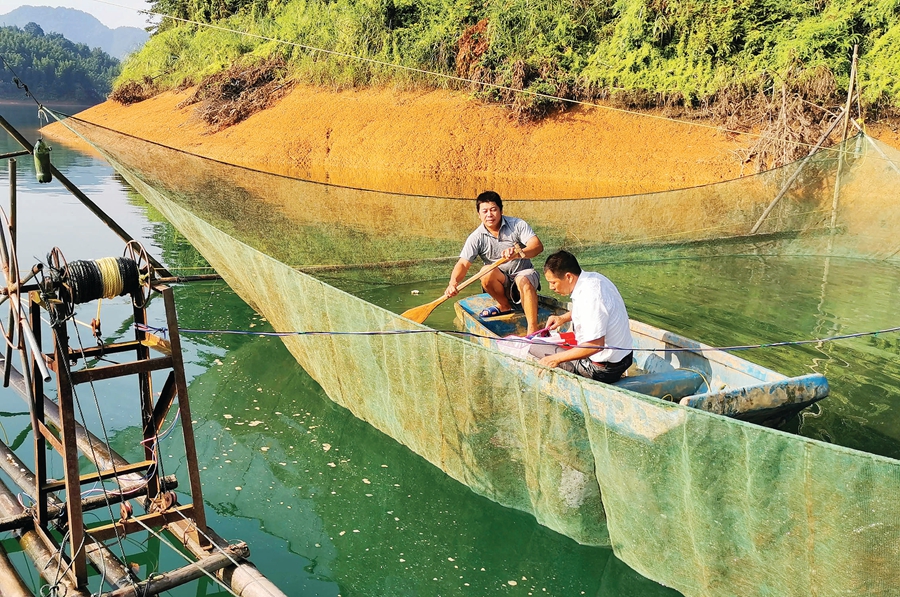 黃偉勝(右)與課題組團(tuán)隊(duì)在天堂山九牛圳野采銀魚。