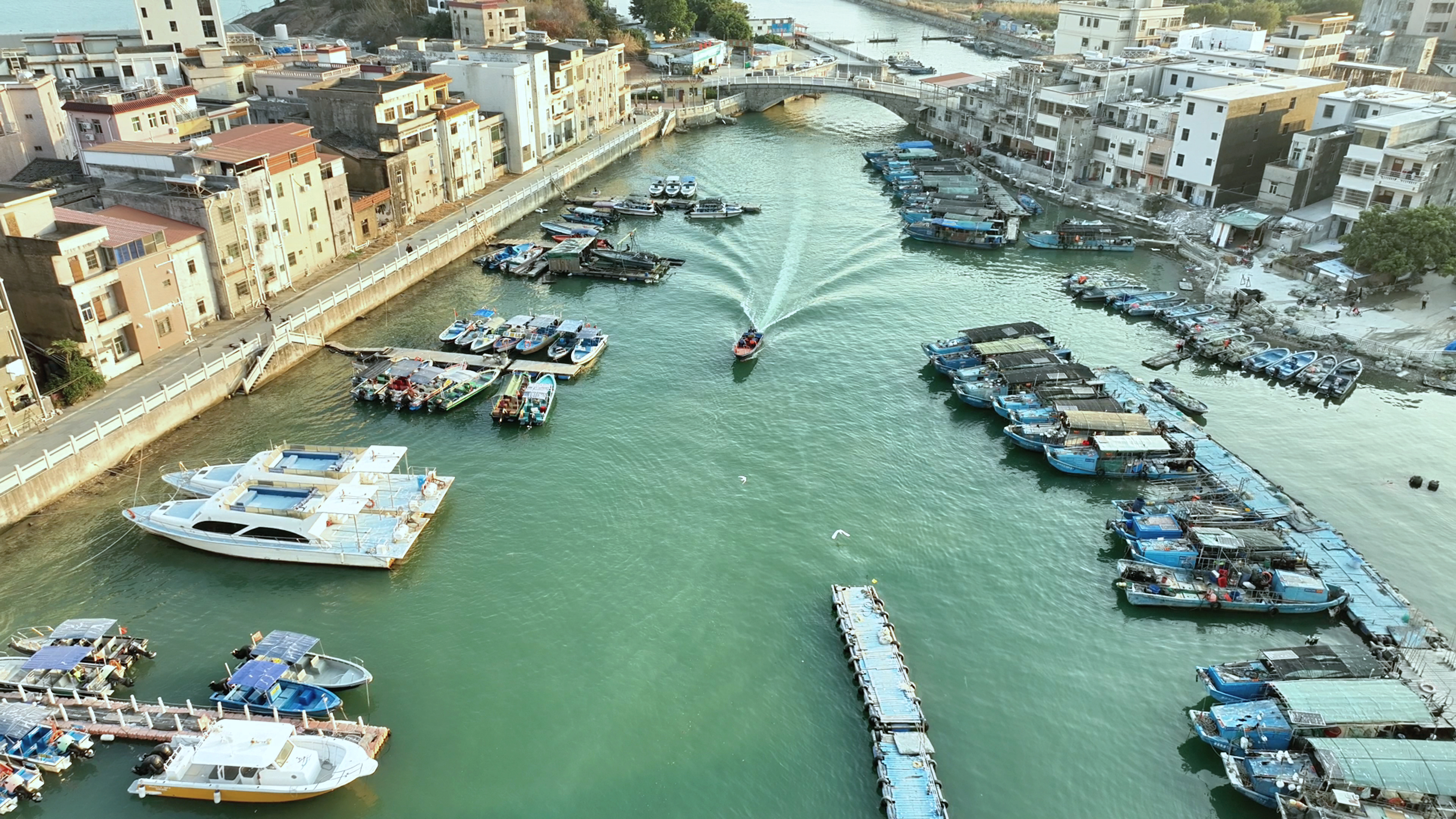 東側(cè)為霞新村,一排排居民房緊密相連,沿河依次而立。風(fēng)和日麗時,沿著包禾塘東側(cè)人行道漫步,別有一番風(fēng)情。傍晚漲潮時,一艘艘休閑漁船在岸邊整齊排列,三五成群的白鷺或在船篷上棲息,或在水面覓食。眼前風(fēng)景讓人頓感歲月靜好。