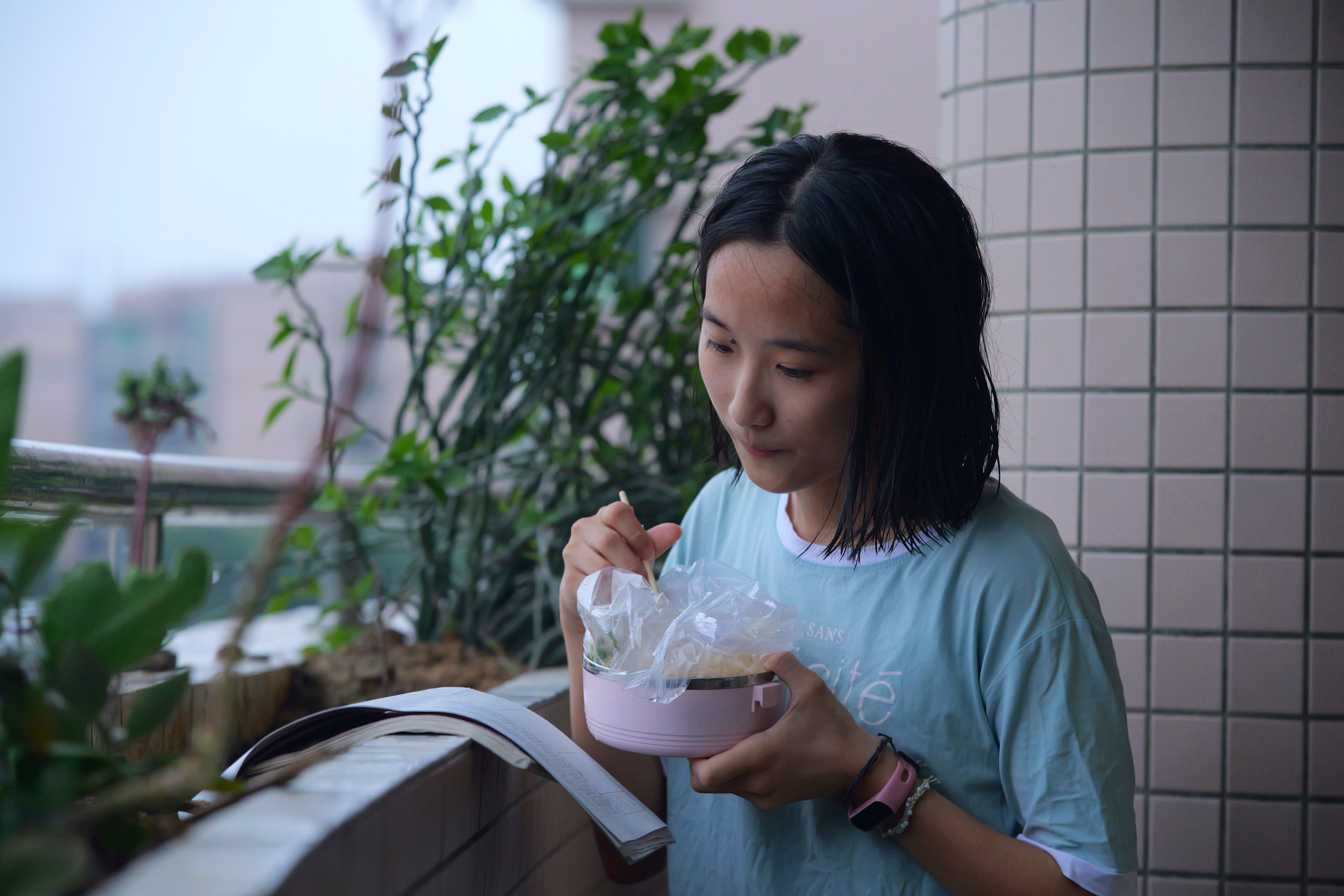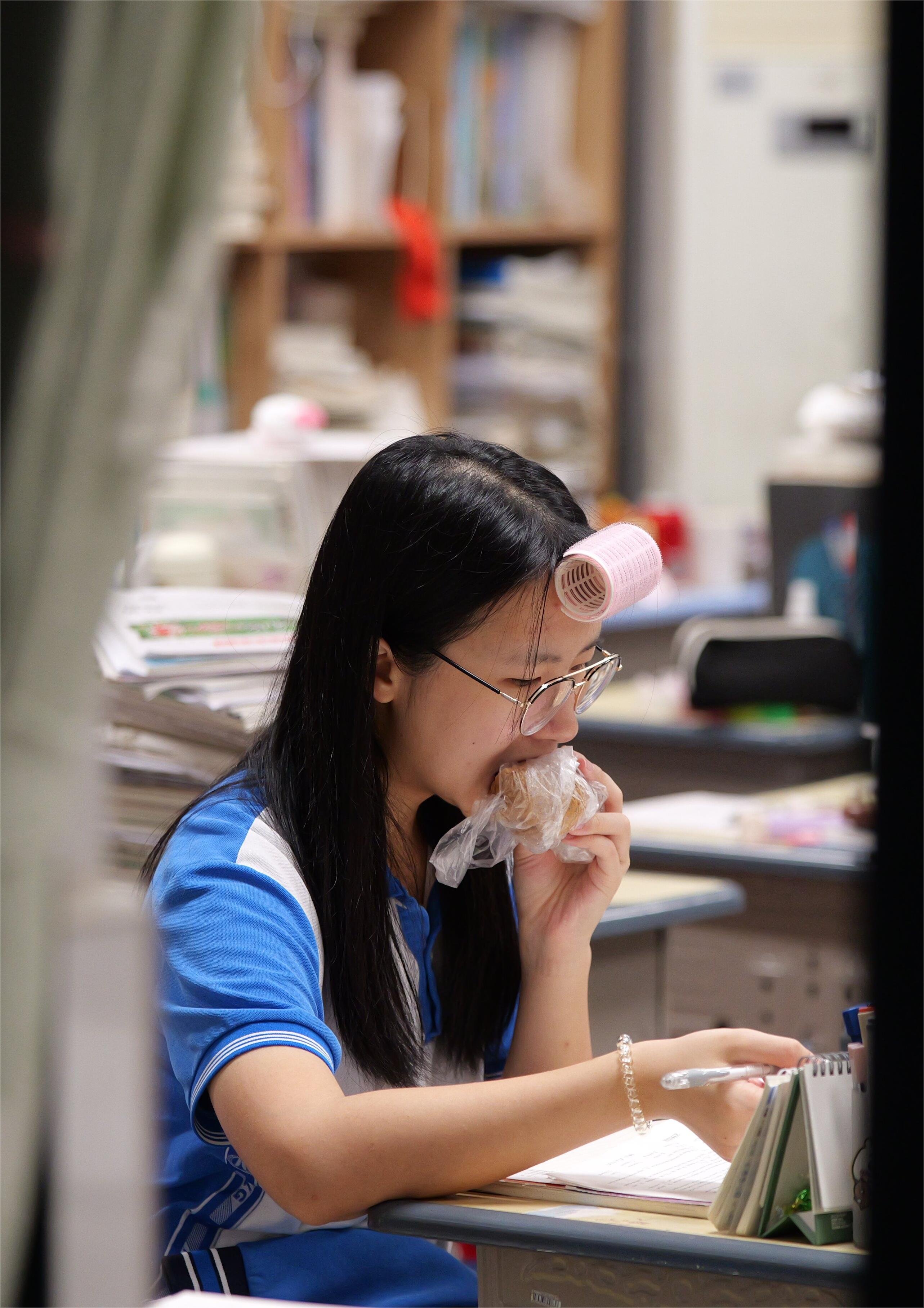 高三(19班)葉雅今告訴記者:”為了有更多的學習時間,許多同學跟我一樣,在飯?zhí)么虬埐藖碚n室邊吃邊學習!