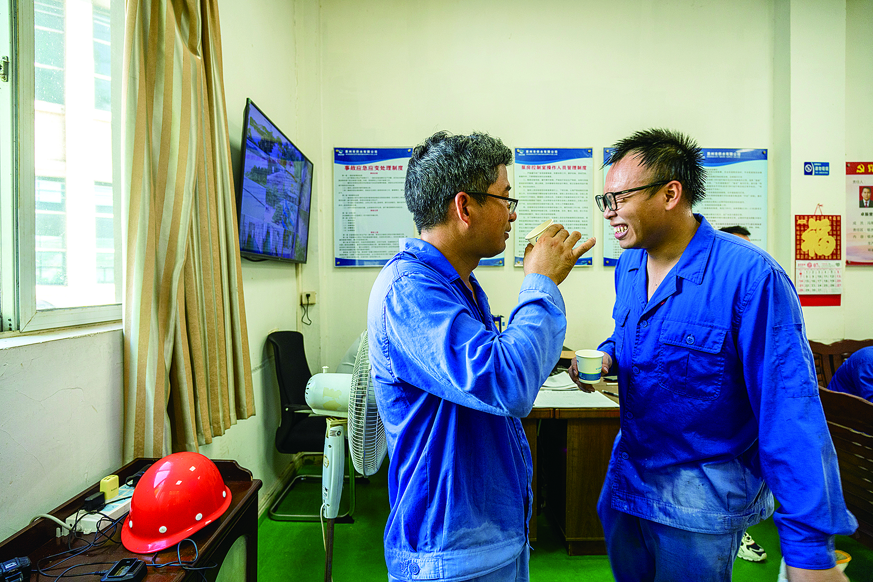 高溫作業(yè)后,工作人員在辦公室內(nèi)休息、補(bǔ)充水分。