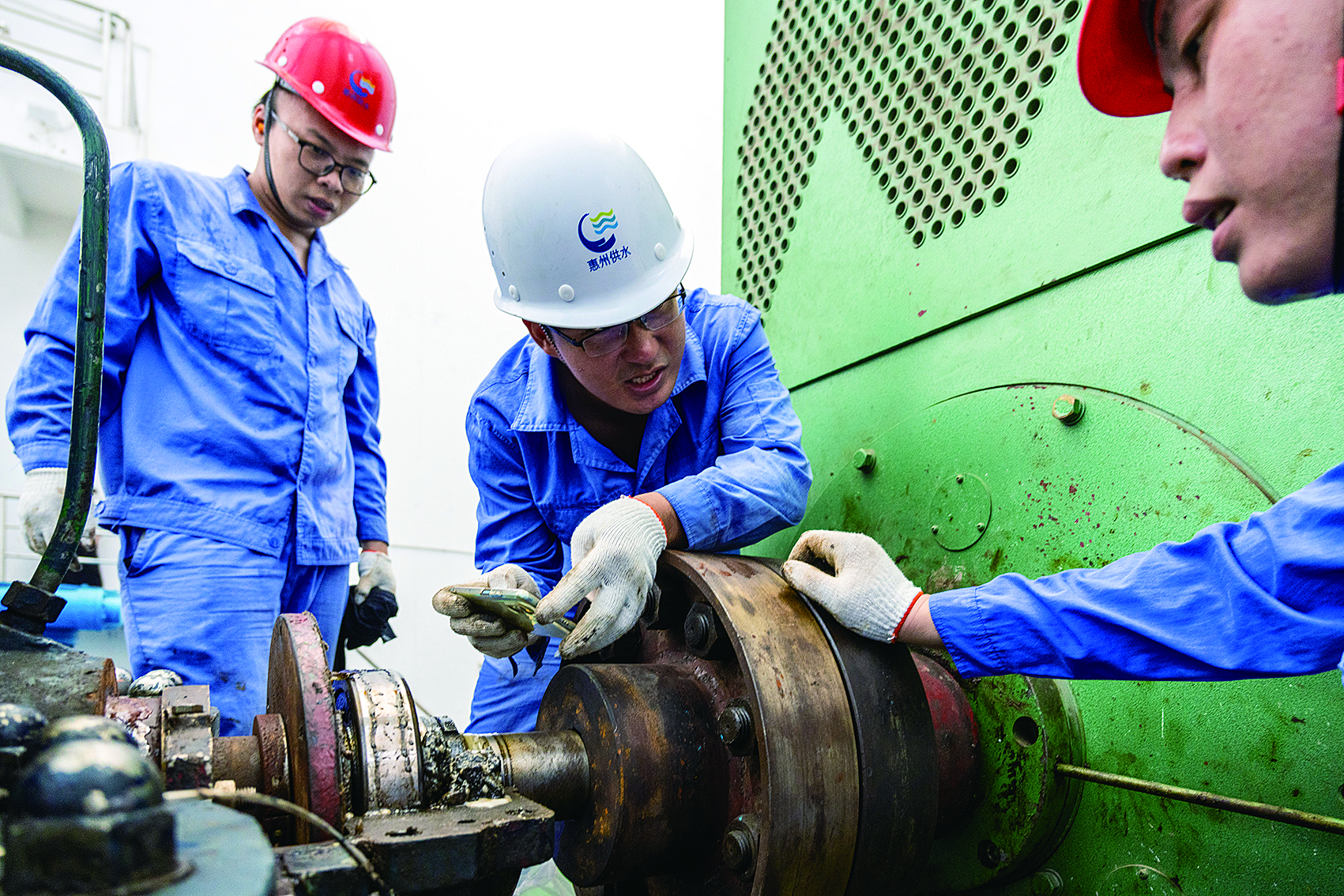 在例行的裝備檢查后,記者跟隨工作人員進(jìn)入狹窄的樓道,再下至地下9層的泵池對設(shè)備進(jìn)行檢修維護(hù)。取水泵房深達(dá)20多米,如吸管一樣插入東江底部,全力將江水抽取到上水管泵。到了泵房底部還顧不得喘氣,工作人員便展開工具,啟動(dòng)一系列機(jī)組設(shè)備巡查計(jì)劃!稗Z隆隆隆隆……“伴隨著水泵葉片高速旋轉(zhuǎn)發(fā)出的低頻混響“搖滾樂”,工作人員一項(xiàng)項(xiàng)檢查電機(jī)、水泵,拆開部件潤滑養(yǎng)護(hù),查看是否有漏水情況,冷卻水是否正常等。