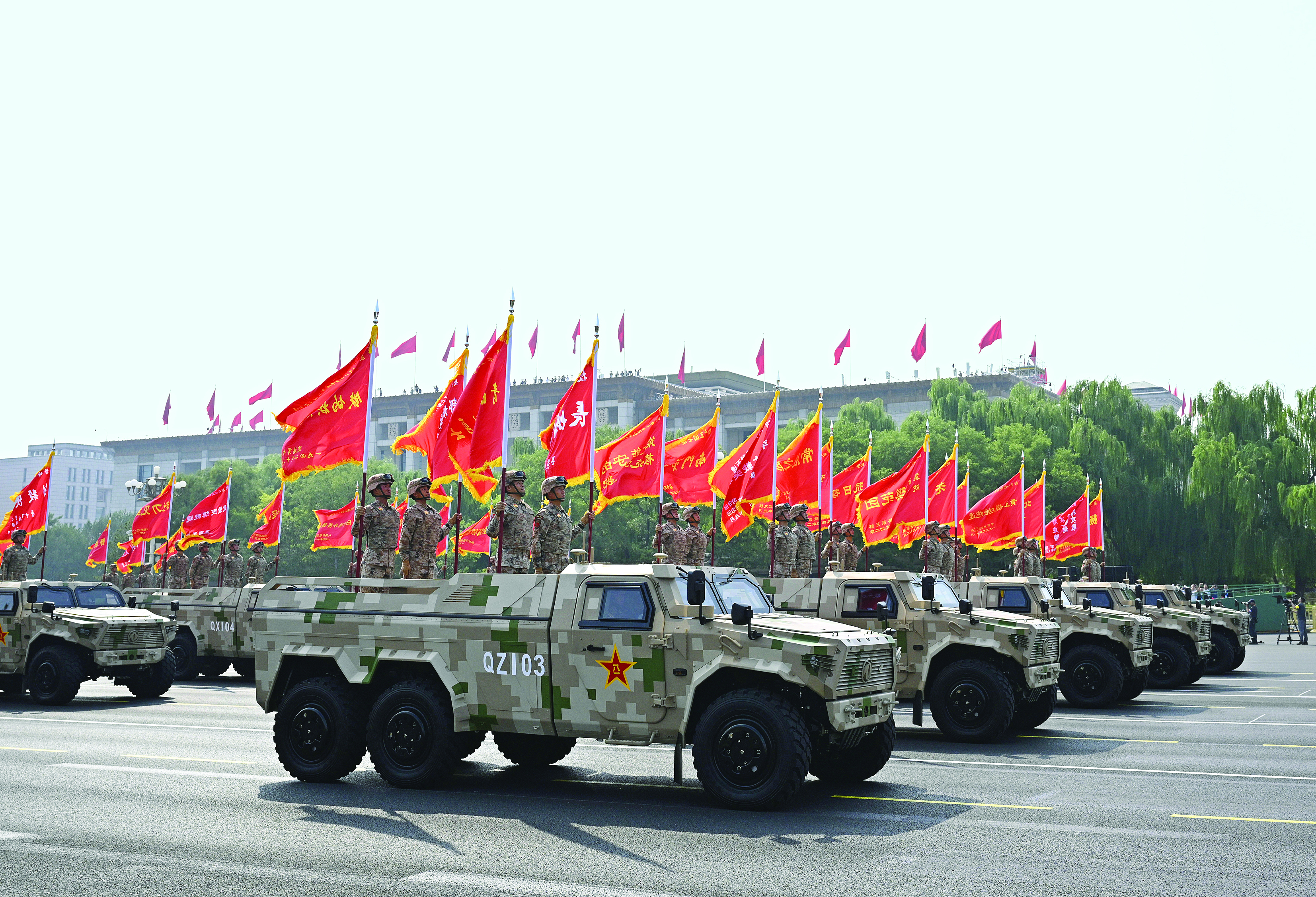 80面抗戰(zhàn)英模部隊榮譽旗幟組成的戰(zhàn)旗方隊,引領(lǐng)裝備方隊以實戰(zhàn)化聯(lián)合編組、分7個作戰(zhàn)群接受檢閱。
