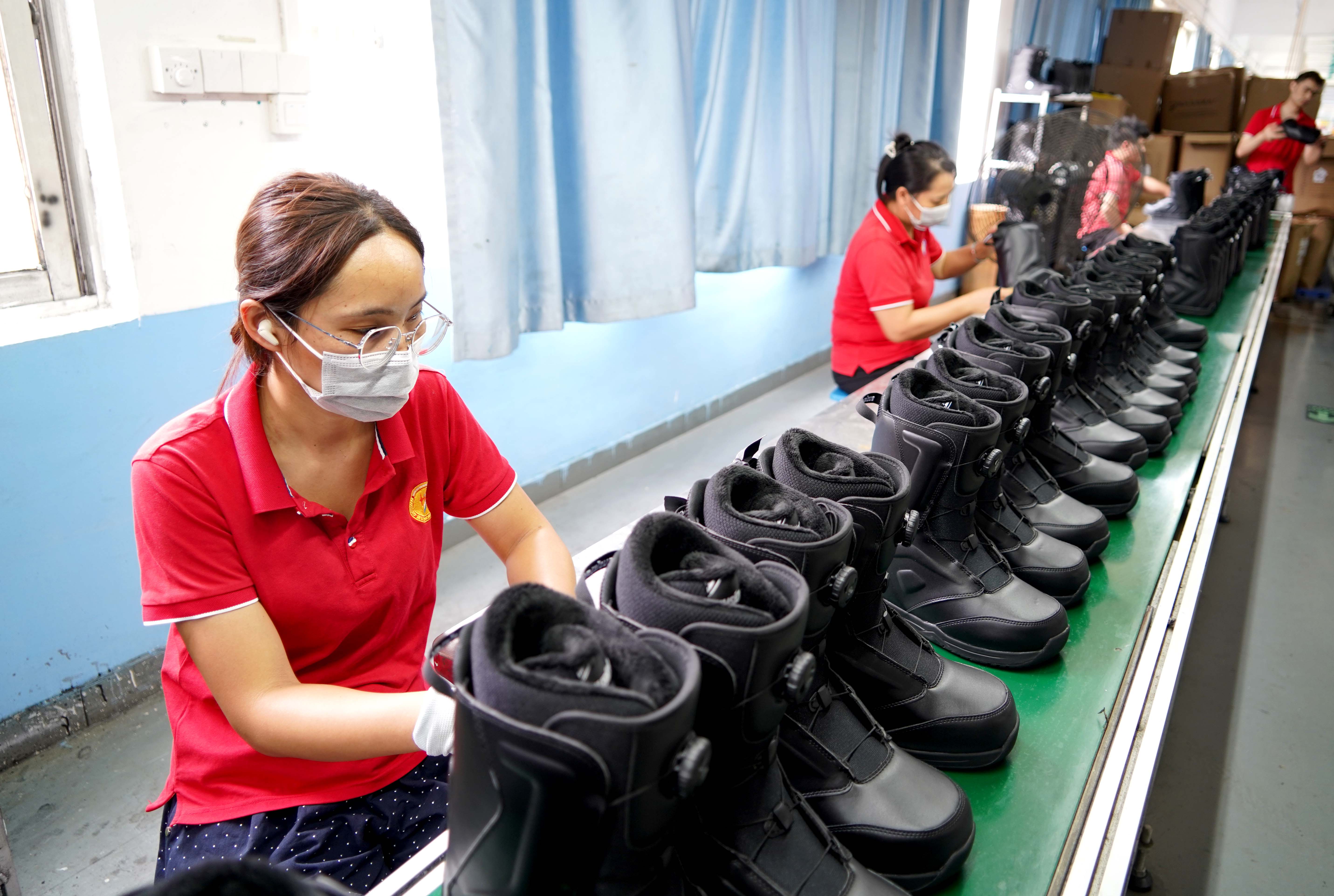 廣東鼎弘欣運動科技有限公司滑雪靴質(zhì)檢車間,工人在認(rèn)真檢查每一雙鞋的質(zhì)量。