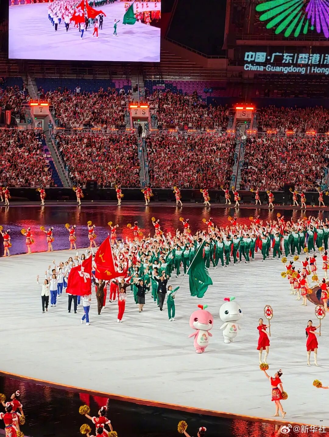 廣東省體育代表團(tuán)、香港特別行政區(qū)體育代表團(tuán)、澳門特別行政區(qū)體育代表團(tuán)在入場儀式上共同入場。圖源:@新華社