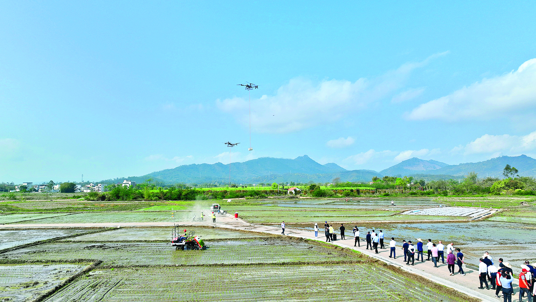 插秧機精準走位,秧行筆直劃一,無人機穿梭田壟運送物資,田間地頭科技感十足。