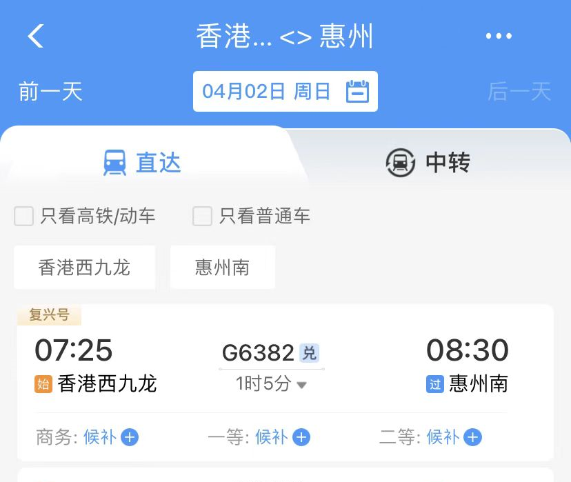 有惠州北站到香港西九龍的列車