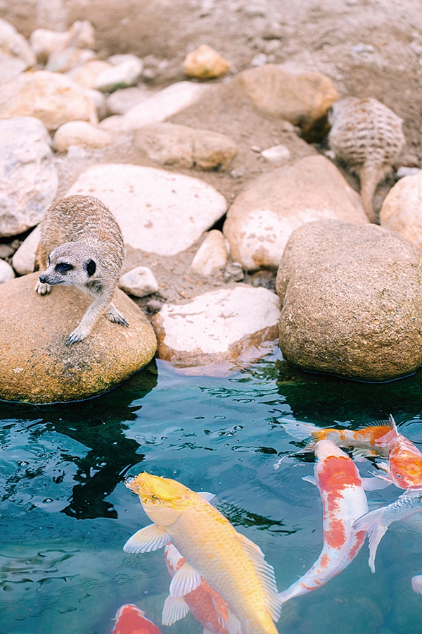 狐獴與錦鯉共存,難得一見。