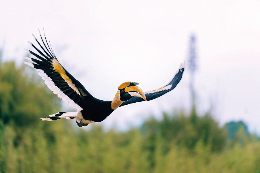 大嘴犀鳥在天空翱翔。