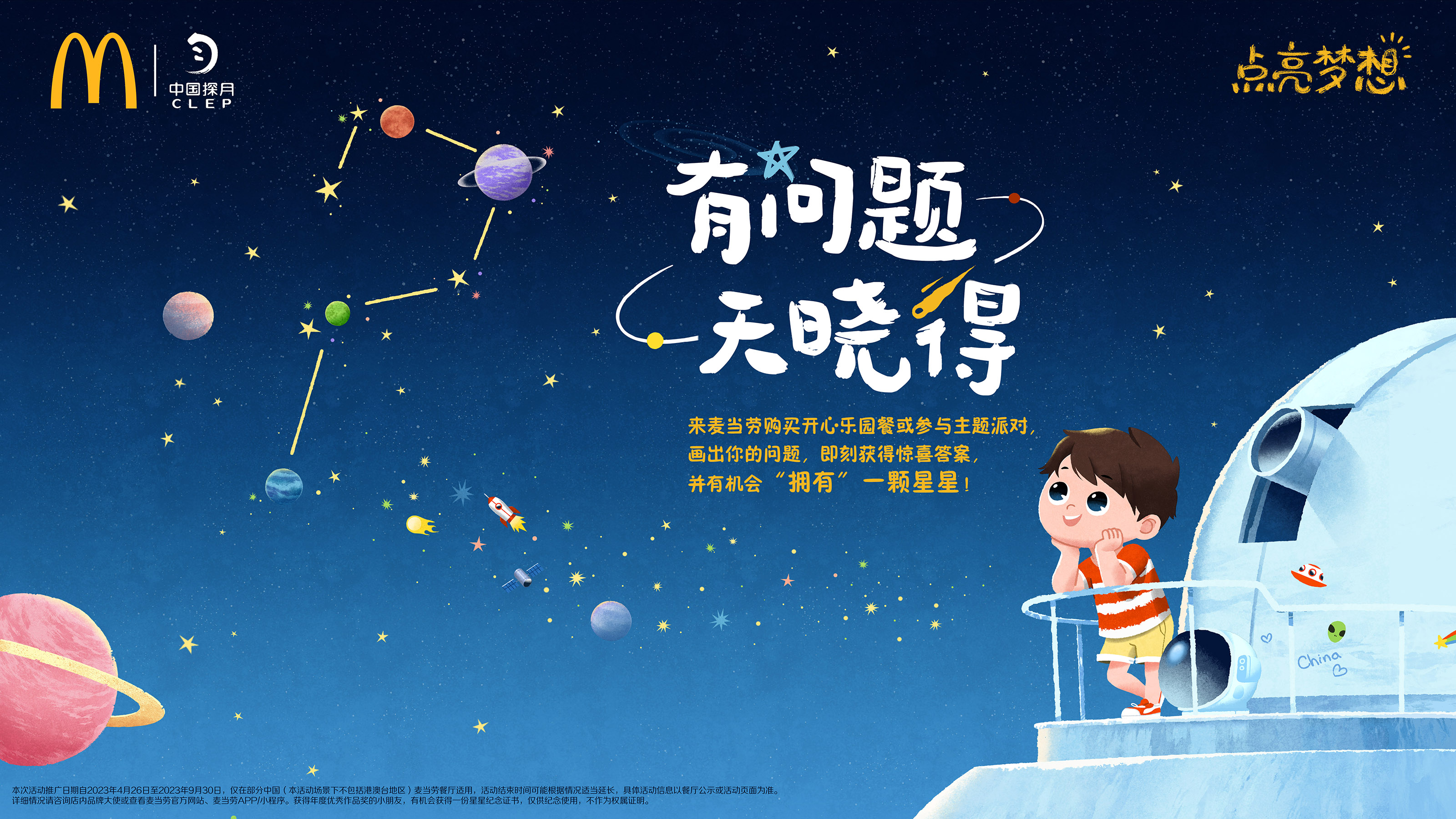 4月26日,麥當(dāng)勞中國正式宣布,攜手“中國探月”,共同啟動2023年“點亮夢想”活動。即日起,消費者前往全國超5000家麥當(dāng)勞餐廳購買開心樂園餐,或在超2000家的麥當(dāng)勞家庭主題餐廳預(yù)約參加“點亮夢想”主題派對,就能得到一張定制畫紙,畫出自己的問題,可以獲得一條驚喜回答,還能得到“中國探月”蓋章認(rèn)證的電子證書。提問小朋友中的優(yōu)勝者,最后還有機會“擁有”一顆星星。