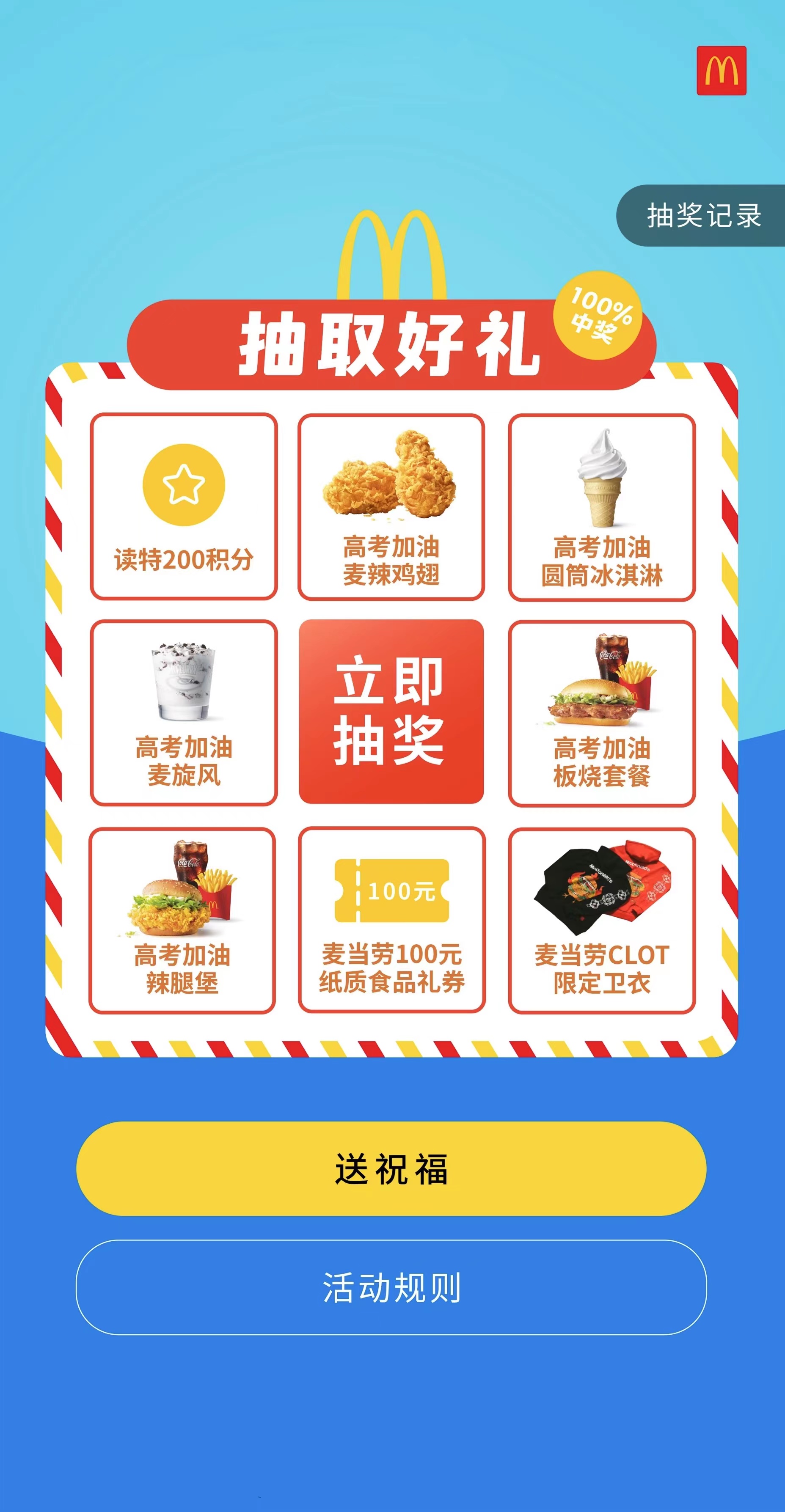 線上活動(dòng)同樣豐富多彩。H5互動(dòng)小游戲——“測測你屬于哪種滿分青年”于高考期間同步上線。6月2日,顧客可以通過互動(dòng)H5,為高考學(xué)子送上滿分祝福,還能領(lǐng)取麥當(dāng)勞準(zhǔn)備的多項(xiàng)福利,有機(jī)會(huì)獲得麥當(dāng)勞CLOT限定衛(wèi)衣、麥當(dāng)勞100元代金券等獎(jiǎng)品。