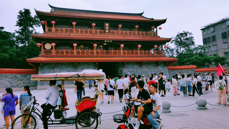 牌坊下的騎樓里,是熱鬧的商家,這里有現(xiàn)代的奶茶、餐飲、小百貨,也有傳承多年的老字號、傳統(tǒng)特產(chǎn)。繁榮的店面間,偶爾可見古城居民或在自家門前悠閑納涼,或三五好友在巷口支起小桌飲茶聊天。一路走走逛逛,逛累了,坐上一輛黃包車,時而在古城中心的人潮中穿梭,時而轉(zhuǎn)進一條小巷遠離了喧囂。奶茶鋪、餅家、便利店、潮州府、駙馬府……坐著這么一輛黃包車,看盡了老街上商家的繁華,走遍了老城里的文化傳承,也感受到了古城居民生活的閑適,各種各樣的生活狀態(tài)呈現(xiàn)于城內(nèi),生動詮釋了“繁華市井生活”。