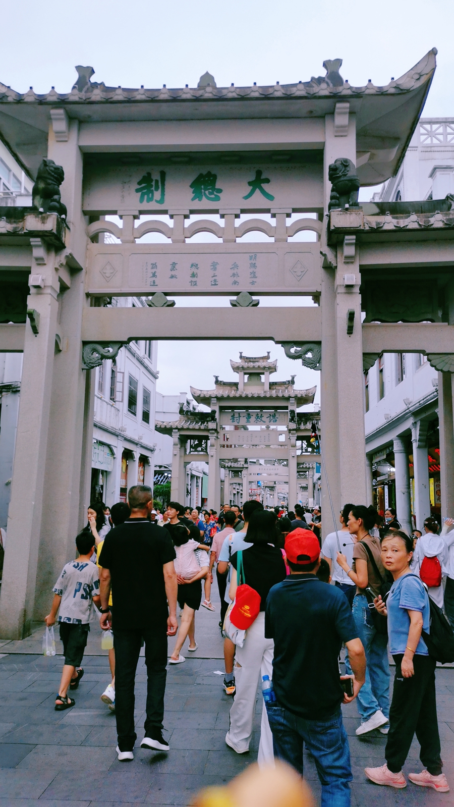 潮州古城位于寒江旁,沿著寒江邊前行,但見保存完好的古城墻至今仍將整個古城極好地保護于其中,沿江的幾座城樓是進出古城的出入口,其中最巍峨壯觀的,是正對廣濟橋的廣濟樓。據(jù)記載,始建于明代的廣濟樓曾在清咸豐三年因失火而遭到毀壞,后得以重建。重建后的廣濟樓還原了曾經(jīng)古色古香的模樣。穿過廣濟門進入古城,街上的建筑是典型的騎樓建筑,雖已經(jīng)過修繕,但老街上仍不時可以看到這些建筑最初的痕跡,或是一塊雕花墻磚,或是一塊老招牌,又或是不同于周邊的樓面,這里留下的,是潮州人下南洋的那段傳奇。再往里走,便可以看到古城里最為出名的石牌坊,“大總制”“少司馬”“四進士坊”“節(jié)鎮(zhèn)三省”“太山北斗”“經(jīng)略邊務”“木天人瑞”……一座座石牌坊向來往游客講述著屬于這座古城的歷史故事和文化內(nèi)涵。再往里走,便越近居民的生活聚居點,銀行、郵局、便利店……現(xiàn)代生活的痕跡越發(fā)清晰,潮州府、駙馬府、陳偉南文化館、古大士庵、孔廟等古今建筑散落于居民區(qū)內(nèi)卻不顯突兀?梢哉f,在這座古城里,完整保留下了明清至今的諸多歷史記憶點。