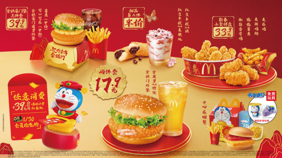 1月24日,麥當(dāng)勞中國宣布開啟“祝你今年金拱門”農(nóng)歷新春主題活動(dòng),同時(shí)連續(xù)第三年攜手上海美術(shù)電影制片廠,以獨(dú)特的鎏金工藝結(jié)合多種藝術(shù)形式,為消費(fèi)者打造“美味”和“美學(xué)”兼?zhèn)涞男麓菏⒀,一同歡慶龍年新春。即日起,消費(fèi)者可陸續(xù)前往深圳、上海、北京、廣州四地的線下快閃活動(dòng),提前感受年味十足的限時(shí)體驗(yàn)。1月27日至2月25日,消費(fèi)者可在麥當(dāng)勞餐廳品嘗到包括金拱門堡、椒鹽香骨雞、菠蘿特飲、開心奶鐵在內(nèi)的12款新春限定美味。屆時(shí),一系列為新春定制的華美鎏金包裝也將隨新品限時(shí)煥新。1月31日起,為龍年新春特別打造的 “哆啦A夢紅包機(jī)” 也將上架發(fā)售。