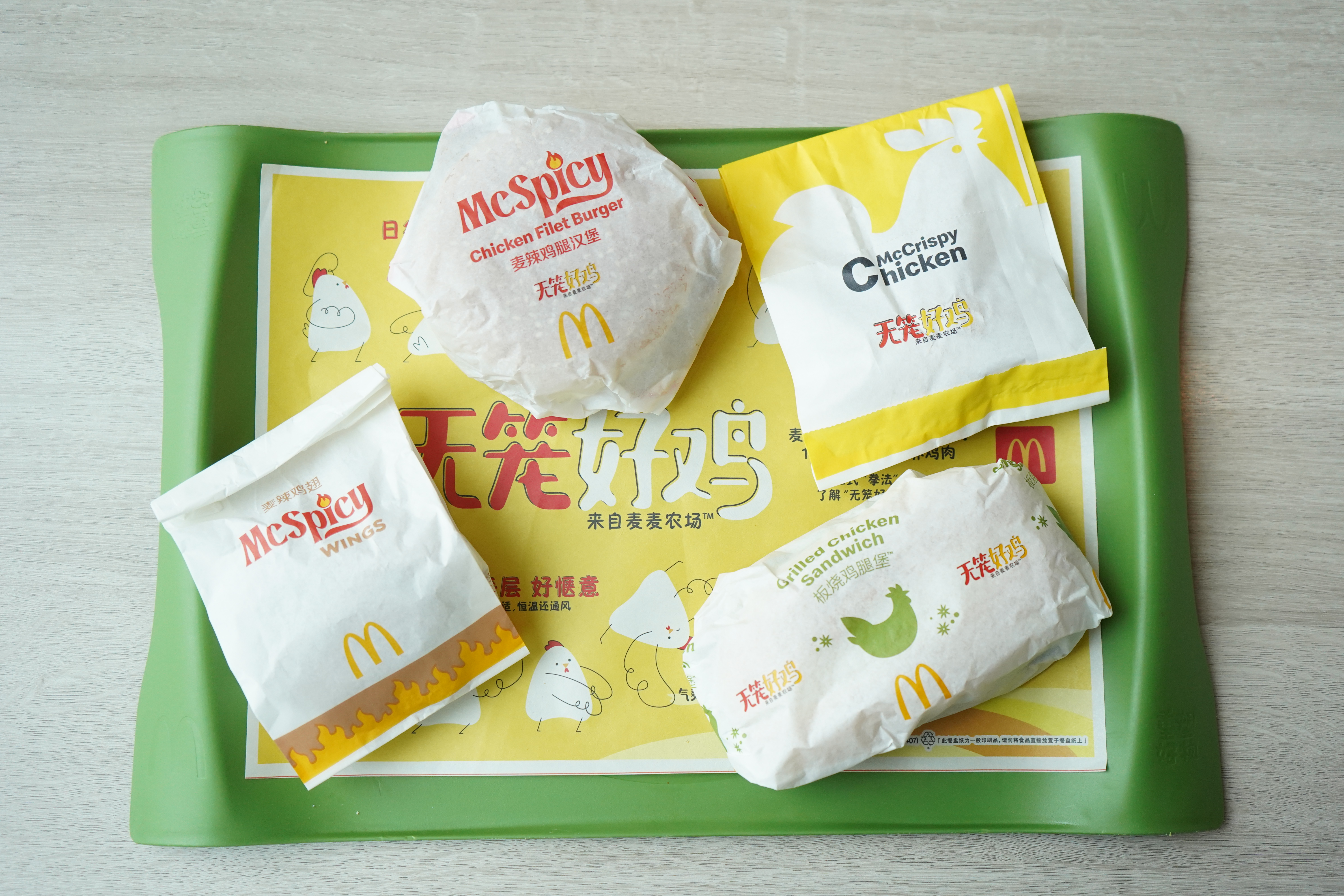 麥當(dāng)勞雞肉產(chǎn)品包裝以及餐盤(pán)墊紙上的“無(wú)籠好雞”標(biāo)識(shí)