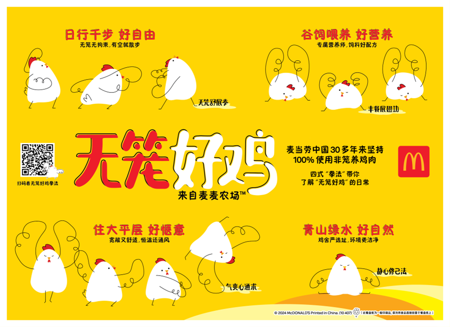 6月19日開(kāi)始,“無(wú)籠好雞”的標(biāo)識(shí)將出現(xiàn)在麥當(dāng)勞雞肉當(dāng)家產(chǎn)品的包裝上,包括麥辣雞腿堡、麥辣雞翅、板燒雞腿堡、麥麥脆汁雞等,麥當(dāng)勞中國(guó)線上點(diǎn)餐渠道也將同步上線“無(wú)籠好雞”標(biāo)識(shí)。麥當(dāng)勞中國(guó)還為“無(wú)籠好雞”設(shè)計(jì)了可愛(ài)的卡通形象,并以四招“無(wú)籠好雞拳法”——“無(wú)籠舒展拳”、“靜心修己法”、“氣爽心通術(shù)”和“豐餐展翅功”生動(dòng)講述白羽雞養(yǎng)殖過(guò)程中的非籠養(yǎng)殖、雞舍選址、平層環(huán)境和谷飼喂養(yǎng),該主題的限定餐盤(pán)墊紙?jiān)谌珖?guó)超過(guò)6000家麥當(dāng)勞餐廳上線。消費(fèi)者還可以下載使用“無(wú)籠好雞”的同款微信表情包。