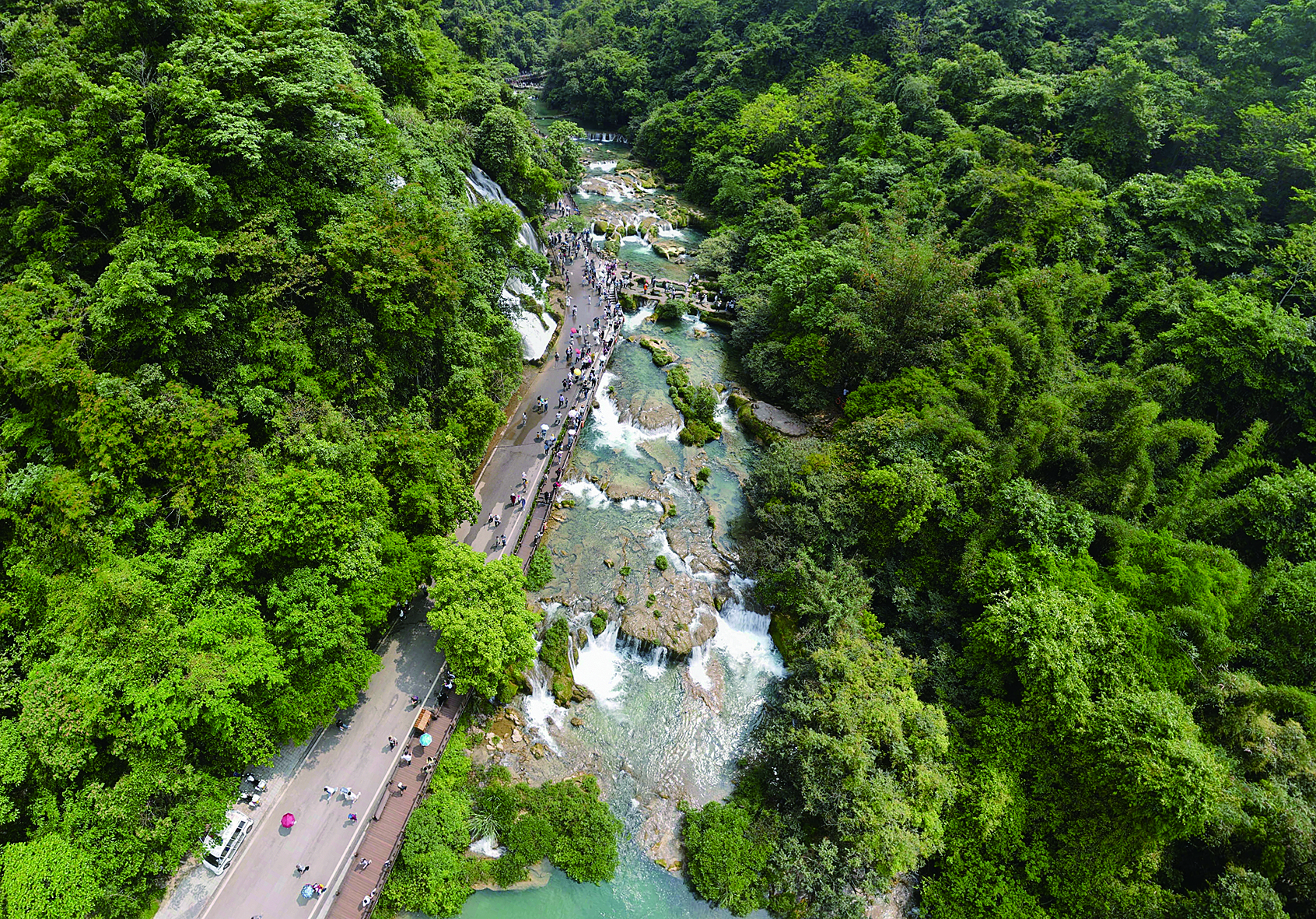 響水河層層疊疊順流而下,在3公里長的河段上形成68級瀑布,落差達(dá)400多米,一路下來,景色猶如畫廊。小七孔古橋臥在碧綠的河水上,連接起貴州和廣西,散發(fā)古橋韻味。