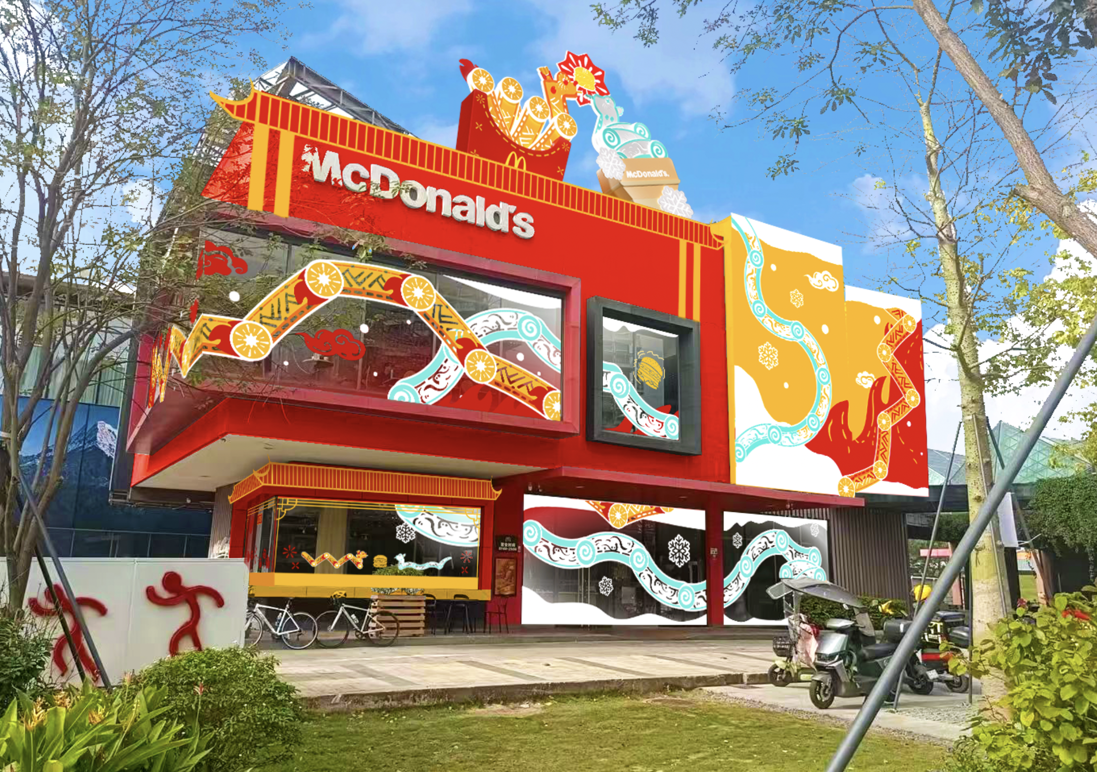首次在深圳龍崗大運(yùn)得來(lái)速餐廳登場(chǎng)的薯?xiàng)l蛇和雪糕蛇店裝,設(shè)計(jì)融合了傳統(tǒng)春節(jié)元素與現(xiàn)代潮流,營(yíng)造出別具一格的喜慶氛圍