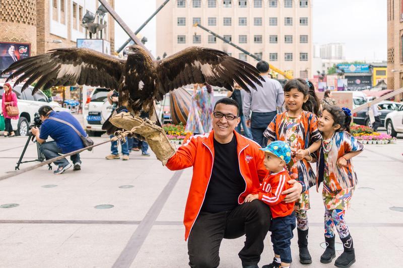 在新疆的大巴扎與鷹歡樂互動(dòng)。